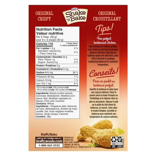 Shake up dinnertime with a family favourite. Shake 'N Bake Original Crispy Coating Mix is the start of some amazing home-cooked meals. Featuring our original blend of spices and bread crumbs you're familiar with, our seasoned coating mix creates crispy, flavourful and juicy food without frying. Easily add a layer of crispiness to bone-in or boneless chicken, or try Shake 'N Bake with pork, vegetables and more. To prepare, simply moisten the chicken with water, shake your food in a reusable container filled with Shake 'N Bake to coat it and bake until it's fully cooked. Shake ’N Bake is an easy family dinner staple that kids love to help make. Each 142 g box comes with two pouches to make a delicious addition to two meals your entire family will enjoy.
